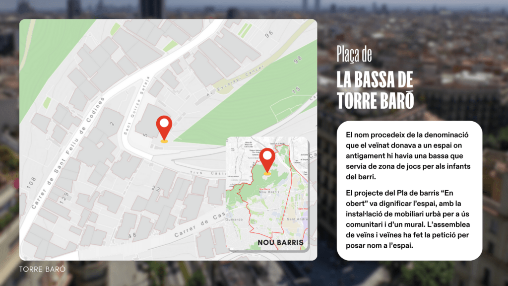 A Torre Baró, el nou espai entre el carrer de Sant Quirze Safaja i l’avinguda d’Escolapi Càncer serà conegut com la plaça de la Bassa de Torre Baró. Aquesta proposta ha estat impulsada per Càritas i l’Associació de Veïns i Veïnes de Torre Baró, amb el suport del Districte, per reconèixer el nom popular que els veïns donaven a aquest indret, on antigament hi havia una bassa que servia de zona de jocs per als infants del barri.