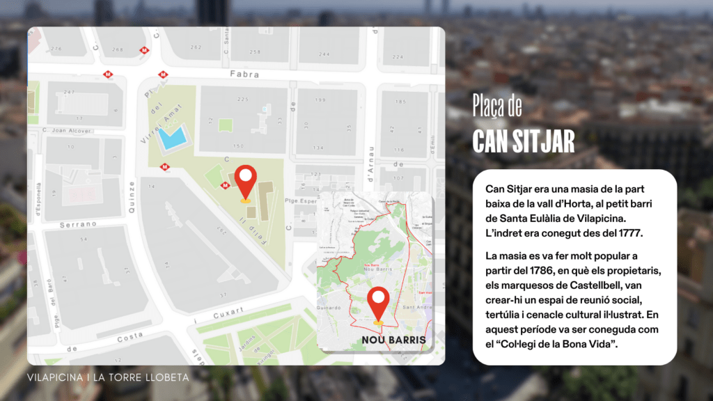 A Vilapicina i la Torre Llobeta, la nova denominació serà la plaça de Can Sitjar. Aquesta plaça pren el nom de la masia històrica de Can Sitjar, situada a la part baixa de la vall d’Horta, en el petit barri de Santa Eulàlia de Vilapicina. Documentada des de 1777, la masia es va fer popular el 1786 quan els marquesos de Castellbell van establir-hi un centre de reunió social i cultural, conegut com el “Col·legi de la Bona Vida”.