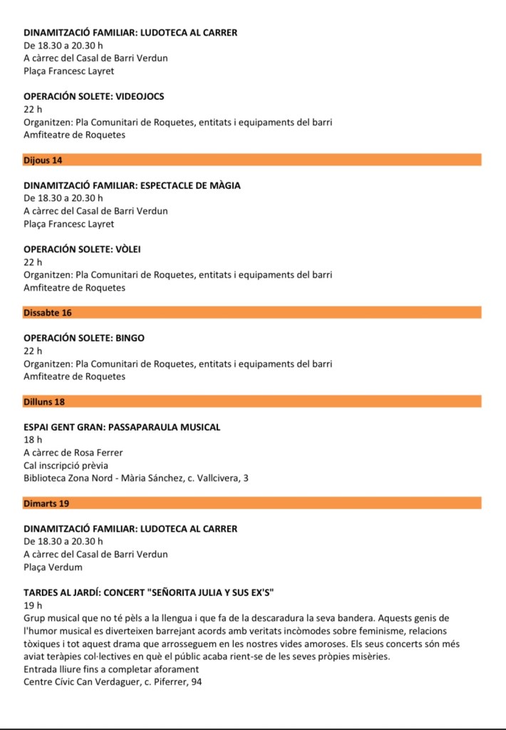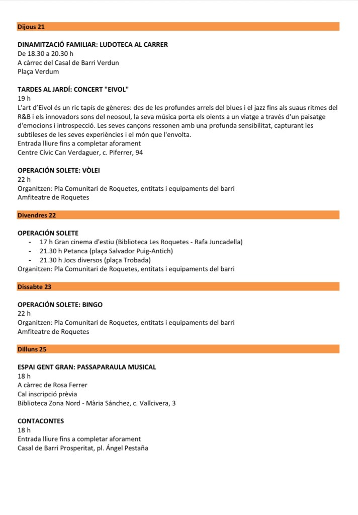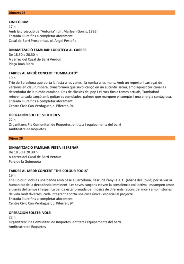 Les activitats no s’aturen amb la música. El programa Operación Solete sumarà projeccions de cinema a la fresca i jocs populars com el bingo i la petanca. A Verdun, el Casal de Barri organitzarà dinamitzacions familiars en diferents espais, mentre que el Casal de Barri Prosperitat oferirà contacontes per als més petits i cinefòrums per al públic adult.