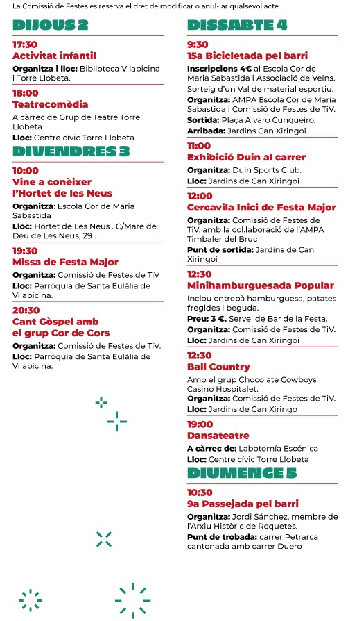 El dissabte 4 d’octubre el protagonisme serà per a la bicicletada popular (9.30 h), amb sortida a la plaça d’Álvaro Cunqueiro i arribada als Jardins de Can Xiringoi. A migdia, el barri s’omplirà de color i ritme amb la cercavila d’inici de festa major (12 h), seguida de la minihamburguesada popular (12.30 h). A la tarda, el Centre Cívic Torre Llobeta acollirà un espectacle de dansateatre (19 h).
