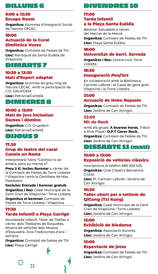 Del 3 al 12 d’octubre, els carrers i places de Torre Llobeta i Vilapicina s’ompliran d’alegria, música i activitats populars en una nova edició de la seva esperada festa major. El programa combina tradició, cultura i propostes per a totes les edats, amb la voluntat de reforçar els vincles veïnals i reivindicar el barri com un espai viu i participatiu.