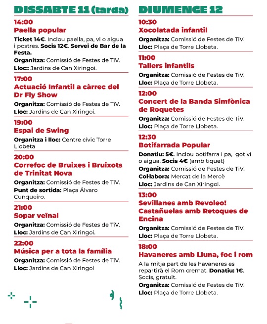 El diumenge 12 d’octubre serà el punt final de la festa, amb una xocolatada i tallers infantils (10.30 h), una botifarrada popular (12.30 h) i una tarda marinera amb havaneres a la plaça de la Torre Llobeta (18 h).